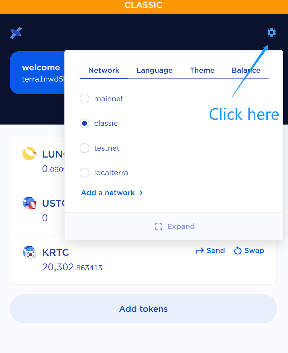 Click the blue gear, switch your network to classic to see your wallet address.